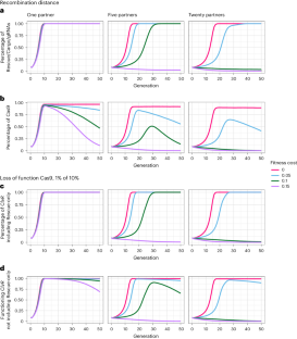 (a-b) ClvR, located inside a gene required in the sporophyte for female fertility, is introduced at a frequency of 10%, with 1 × 10-6 of the ClvR elements having been transposed to a new unlinked locus, which is not required for female fertility. Individual runs are shown here, in a linear scale (a) and logarithmic scale (b). (c-d) ClvR, located inside a gene required in the sporophyte for female fertility, is introduced at a frequency of 10%. Additionally, a translocated WT version of the fertility locus is present at a third locus, not associated with ClvR, at an allele frequency of 5 × 10-7 (100 out of 100,000,000 individuals are heterozygous for this translocated fertility gene), such that individuals with that gene may be both ClvR homozygous and fertile. Individuals runs are shown on a linear scale (c) and a logarithmic scale (d).