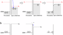 The fitting analysis of ESR spectra indicates that the ESR spectra comprise a narrow Lorentzian formula (Signal A) and a broad Gaussian formula (Signal B) (Fig. 3c). In the dark, the spectrum can be fitted successfully to a Lorentzian signal (Signal A) with g = 2.0028 ± 0.0001 and ΔHpp = 0.44 ± 0.01 mT, which is derived from mobile polarons in PEDOT. Under illumination, a Gaussian signal (Signal B) with g = 2.0028 ± 0.0001 and ΔHpp = 1.69 ± 0.01 mT appears. The broad linewidth suggests low mobility of polarons, indicating that Signal B is derived from localized PEDOT polarons. Figure 3d presents the transient response characteristics of Nspin and VOC. The Nspin of Signal A decreases from 5.1 × 1013 to 4.3 × 1013 after 19.5-h illumination and increases to 5.0 × 1013 after subsequent storage in the dark for 9.5 h. The decreased Nspin of Signal A can be ascribed to the de-trapping of electrons at PEDOT polarons, which converts them into bipolarons. In contrast, Gaussian signals are not observed in the dark but appear under illumination. The Nspin of Signal B increases from 0 to 1.0 × 1014 after 19.5 h irradiation and decreases to 7.7 × 1013 after subsequent 9.5-h dark storage. The increased Nspin of Signal B suggests that some electrons diffuse from (BA0.5PEA0.5)2FA3Sn4I13 to PEDOT:PSS under illumination. These electrons are trapped by bipolarons and leave localized, relatively immobile polarons, which are possibly located near the PEDOT:PSS/(BA0.5PEA0.5)2FA3Sn4I13 interface. The absolute value of the variation of the Nspin under illumination, ΔNspin, for Signal A (0.8 × 1013) is one order of magnitude smaller than that for Signal B (1.0 × 1014). Therefore, the change in Signal B mainly contributes to the total Nspin. Signal B might therefore have a strong effect on VOC improvement. From this finding, we surmise that the electron diffusion from (BA0.5PEA0.5)2FA3Sn4I13 to PEDOT:PSS under illumination contributes to the VOC improvement of RP Sn-based PSCs.