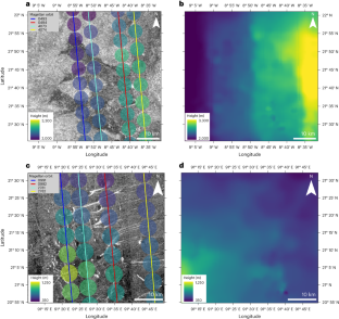 D.S. led the writing of the paper, conducted all the analyses and interpreted the geological and geomorphological results presented in this article. G.M. was responsible for the conceptualization of the project and the manuscript, provided support in manuscript writing and assisted in the geological interpretation of the data. M.M. provided support in the analysis of the data, particularly in the radar and altimeter data analysis, and the interpretation of the results pertaining to the radar part. He also contributed to manuscript writing, specifically in the sections related to the electromagnetic models and alternative hypotheses regarding the radar section.