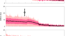 The timescales and pathways by which ΔDIC enters (and leaves) the ocean were reflected in the spatial and vertical distributions of excess DICpre (ΔDICpre) and excess DICremin (ΔDICremin) (Fig. 2). During the ramp-up phase, anthropogenic CO2 entered the ocean essentially everywhere at the surface (Fig. 2a). Accordingly, the largest ΔDICpre was in the warm water sphere at the end of ramp-up period (Fig. 2a) as a consequence of the elevated pre-industrial surface ocean CO2 buffer in warm low-latitude surface waters compared with cold high latitudes (Supplementary Fig. 1a, black line) and intensive ventiliation of intermediate and mode waters2,28,29,30,31. The former is consistent with the latitudinal distribution of the Revelle factor (for example, ref. 27). At the end of the ramp-down phase in year 140 (Fig. 2d), the ‘bowl’ of most elevated ΔDICpre (orange area in Fig. 2a) had disappeared whereas moderately elevated ΔDICpre had been transported southwards in the interior ocean with the flow of North Atlantic Deep Water and northwards with the flow of Antarctic Intermediate Water. Waters at the very surface, however, started to show negative ΔDICpre compared with the pre-industrial status, as a consequence of rapid equilibration with the atmosphere under conditions that were still warmer than pre-industrial sea surface temperatures (Fig. 1e; change in sea surface temperature (ΔSST) = 0.38 °C) and pre-industrial-like \({p}_{{\mathrm{CO}}_2^{{\mathrm{atm}}}}\) boundary conditions (Fig. 1a). By the end of our experiment in year 500, ΔDICpre in surface and deep waters had reduced further (Fig. 2g).