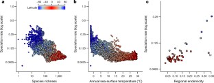 Extended Data Fig. 4 Speciation rate, species richness, temperature and endemism.