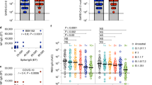 Sera from individuals (n = 38) who had been infected with SARS-CoV-2 or recovered from COVID-19 were drawn from donors 18–83 years of age at least 14 days after PCR-confirmed diagnosis and at a time at which the participants were asymptomatic. The mean age of the donors was 45 years. GMTs in subgroups of the donors were as follows: symptomatic infections, 90 (n = 35); asymptomatic infections, 156 (n = 3); hospitalized, 618 (n = 1). Sera were obtained from Sanguine Biosciences, the MT Group and Pfizer Occupational Health and Wellness. The data presented for these sera have previously been reported2,13,14. PBMC samples from individuals (n = 18) who had been infected with SARS-CoV-2 or recovered from COVID-19 were collected from donors 22–79 years of age 30–62 days after PCR-confirmed diagnosis, when donors were asymptomatic. PBMC donors had asymptomatic or mild infections (n = 16, clinical score 1 and 2) or had been hospitalized (n = 2, clinical score 4 and 5). Blood samples were obtained from the Frankfurt University Hospital.