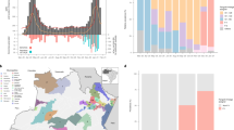 Our data cover England between 1 September 2020 and 26 June 2021, encompassing three epidemic waves and two national lockdowns (Fig. 1a). In this time period, we sequenced 281,178 viral genomes, corresponding to an average of 7.2% (281,178/3,894,234) of all of the positive tests from PCR testing for the wider population, ranging from 5% in winter 2020 to 38% in early summer 2021, and filtered to remove cases that were associated with international travel (Methods and Extended Data Fig. 1a, b). Overall, a total of 328 SARS-CoV-2 lineages were identified using the PANGO lineage definition5. As some of these lineages were only rarely and intermittently detected, we collapsed these on the basis of the underlying phylogenetic tree into a set of 71 lineages for modelling (Fig. 1b–d and Supplementary Tables 1 and 2).