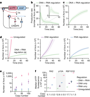 a) Modelled mean acrIF8–aca2 mRNA levels (solid green line) over a period of 60 min, with the standard deviation indicated by lighter shading. b-d) Acr production rates as in Fig. 5b but for different modes of regulation: only DNA-based transcriptional regulation (b), only RNA-based translational regulation (c), or no regulation (d). The green line in panels b-d represents the fully regulated state for comparison (same data as displayed in Fig. 5b). e) Time courses corresponding to the end point data in Fig. 5e for the indicated modes of regulation and final phage genome copy numbers. All modelling data shown is the mean (solid line) and standard deviation (shading) from 200 simulations. f) Experimental data for plasmids of different origins and unregulated eyfp–aca2 operons, with eYFP fluorescence detected by flow cytometry (mean and standard deviation of four biologically independent replicates). The determined copy numbers for each plasmid are indicated with a circle.