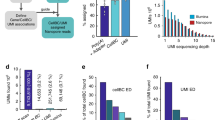 Simulated UMI data were generated with a length of 16 (8 blocks of nucleotide pairs) to confirm the accuracy of the UMI correction method by mimicking UMI PCR amplification and sequencing errors seen with Oxford Nanopore sequencing. UMIs were generated following an approach that was initially proposed by UMI-tools6. In brief, each UMI was generated at random, with a uniform probability of amplification (0.8–1.0). PCR cycles were simulated so that each UMI was selected in turn and duplicated according to the probability of amplification. PCR errors were added randomly and then any new UMI sequences were assigned new probabilities of amplification. A defined number of UMIs were randomly sampled to simulate sequencing depth and sequencing errors introduced with a specified probability. Finally, the presence of mismatched double nucleotides within the UMI were checked for and if errors were detected, the UMIs were split into two and then separately collapsed into 8 bp nucleotides. Unambiguous UMIs were collapsed into 8 bp nucleotides without splitting. The number of true UMIs was then estimated from the final pool of UMIs using UMI correction methods proposed in the original UMI-tools manuscript6. The following values were used as values within the simulations. Sequencing depth, 10–400; number of UMIs, 10–100; UMI length, 6–16; PCR error rate, 1 × 10−3 to 1 × 10−5; sequencing error rate, 1 × 10−1 to 1 × 10−7; and number of PCR cycles, 4–12.