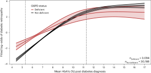 Extended Data Fig. 1 Line graph summarizing the fitted log-odds of diabetic retinopathy and corresponding 95% confidence band by mean HbA1c post diabetes diagnosis, stratified by G6PDdef risk allele status in men of NH-AFR ancestry with diabetes.