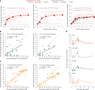 a, Time course of gene therapy shown as the improved thresholds (y-axis) by the ASSR. The red and grey dots represent the average data, while other slight lines represent the individual data. The red dots and lines represent the thresholds for participants in this trial, and the grey dots and lines represent the thresholds for 11 ears from the 8 patients in published articles. The thick red and grey lines showed the fitted exponential growth functions of the improved thresholds with the R2 being shown in the panels. b, Correlation between improved PTA thresholds and improved ASSR thresholds and at 0.5-1 month (left panel) and 4-12 months (right panel) after injection. The solid green and yellow lines represent linear fits to the data, with the regression equations and R2 being shown in the panels. The red dashed diagonal lines represent the theoretical perfect fit with R2 = 1.