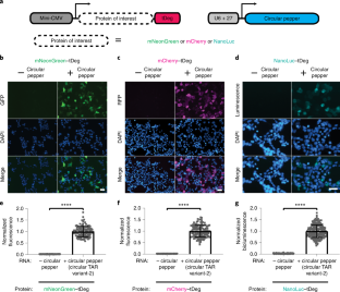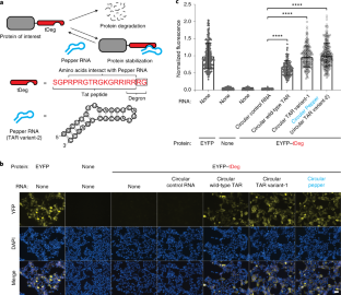 In Fig. 2, we showed that tDeg confers Pepper RNA-dependent regulation of different fluorescent proteins and the luciferase, NanoLuc2. Here we tested whether tDeg confers Pepper-dependent regulation to proteins with different functions and localizations in cells (a). In these experiments, HEK293T cells transiently expressed EGFP-TetR-tDeg (b, e), EGFP-EZH2-tDeg (c, f), or mCherry-NF-κB-tDeg (d, g), with and without the circular Pepper RNA aptamer, respectively. In each case, proteins were nearly undetectable unless coexpressed with the circular Pepper RNA. Furthermore, we compared protein localization of these proteins without tDeg and the circular Pepper RNA to their stabilized counterparts by tDeg and circular Pepper RNA. We observed that EGFP-TetR-tDeg with circular Pepper RNA showed more green fluorescent signals in the cytosol compared to EGFP-TetR. We did not observe significant change of protein localization in the case of EGFP-EZH2-tDeg or mCherry-NF-κB-tDeg with the circular Pepper RNA. We concluded that tDeg is a versatile tag for RNA-dependent protein stabilization. All cells were stained with Hoechst dye. Scale bar, 40 μm. Normalized total cellular fluorescence (e, f and g) of individual cells is plotted (n = 3 independent cell cultures). Values are means ± s.d. ****PEGFP-TetR-tDeg = 2.9 x 10-136; ****PEGFP-EZH2-tDeg = 1.1 x 10-120; ****PmCherry-NF-κB-tDeg = 3.5 x 10-119 by unpaired two-tailed Student’s t-test. 2. Hall, M. P. et al. Engineered luciferase reporter from a deep sea shrimp utilizing a novel imidazopyrazinone substrate. ACS Chem. Biol. 7, 1848–57 (2012).