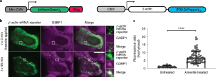 In Fig. 3, we showed that cytosolic green fluorescent puncta accumulated in stress granules to form foci upon application of 500 µM arsenite. However, the formation of green fluorescent foci in stress granules could be due to aggregation of the fluorogenic protein, (mNeonGreen)4-tDeg, regardless of the present of the β-actin mRNA. To test whether this is the case, we coexpressed (mNeonGreen)4-tDeg with circular Pepper RNA in U2OS cells (a). Before arsenite treatment, we observed cytosolic green fluorescent without any puncta, which is consistent with our results in Supplementary Fig. 4. Upon application of 500 µM arsenite, we did not observe any green fluorescent foci formation (b). These results confirmed that the formation of green fluorescent foci in Fig. 3 was indeed due to the β-actin mRNA. This experiment was performed twice with similar results. Scale bar, 20 μm.
