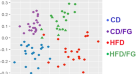 A total of 1,304,100 reads were used for microbiota analysis, and 855 sequence variants were detected. No significant changes in phyla-level microbiota composition were observed across the treatment groups (Fig. 4[A]). Bacteroidetes and Firmicutes made up ~90% of sequences at phyla level. There were also no significant differences in OTU richness or Shannon diversity scores. In general, inter-individual differences in gut microbiota composition were greater than treatment effects. Principle Coordinates Analysis (PCoA) using Bray-Curtis distances suggests that samples from an individual were more similar than samples between individuals, regardless of treatment group (Fig. 4(B)); however, levels of response varied with certain individuals displaying a large amount of variability between sample time points (i.e., Hop4, Hop7, Hop15 and Hop20) (see Supplemental Materials Fig. S2).