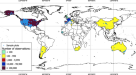 Color-coded cross-correlation values between the different variables analyzed in this work. Locations with less than 100 mm of MAP were excluded from this study. Shades of red, yellow and green represent increasing magnitude of correlations irrespective of the sign. Absolute values of latitude were used for estimating correlation. Both Pearson’s (above the solid black diagonal line) and Spearman’s (below the diagonal line) correlation values (r) are presented. See Table 1 for variable description.