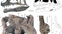 The dentary (Fig. 3A–C) measures 645 mm from the tip back to the level of the coronoid process; the bone measures 894 mm along the long axis as preserved, however the posteroventral end is broken; it may have measured around 900 mm when complete. By comparison, corresponding measurements for the holotype of Tyrannosaurus rex are 589 and 855 mm; RSM P2523.8, one of if not the largest known T. rex specimens25, measures ~ 650 from the tip of the dentary to the coronoid process. Tyrannosaurus mcraeensis therefore overlaps T. rex in size (Fig. 5A), although the holotype is smaller than the largest known T. rex individuals. The dentary has 13 alveoli, a low tooth count uniquely shared with T. rex5 which typically has 13 dentary alveoli, and rarely 14 or 1526 alveoli. Zhuchengtyrannus has 15 teeth, Tarbosaurus has 14–1512,13; Daspletosaurus horneri10 and D. torosus have 17. The first alveolus is smaller than the second, as in other tyrannosaurins. The symphysis is deep, being about 125% the depth of the dentary at mid-length, as in T. rex. The symphysis’ anteroventral margin rises up steeply, creating a squared-off chin, again as in T. rex. The dentary’s occlusal margin rises up steeply at the back forming a strongly concave dorsal margin, as in other tyrannosaurines5,12,13,14. Unusually, the dentary’s posterior end is shallow and upturned; it is deep and typically has a downturned ventral margin in T. rex and other tyrannosaurids5,14,24. This condition is unique to T. mcraeensis but approached in Tarbosaurus5,12 and Zhuchengtyrannus13. The angular process projects posteriorly, as in Tarbosaurus and Zhuchengtyrannus13 but unlike T. rex and other tyrannosaurids, where it projects posteroventrally5,14,24.