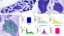 Neurolucida® 360 (MBF Bioscience) was used for the TEM data segmentation of all individual myelinated and unmyelinated axons within the endoneurium space of individual nerve fascicles. For myelinated axons, the outer and inner contours of individual myelin sheaths were segmented. Individual segmented nerve fiber enclosures provided raw data files, which included the cross-sectional area, perimeter, and centroid. The shape-adjusted ellipse (SAE) approach was applied to calculate the corrected diameter for myelinated and unmyelinated axons as the minor diameter of an ellipse using the cross-sectional area and perimeter length31. The G-ratio was calculated as the ratio of the SAE-corrected diameters for the axon proper and corresponding myelinated fiber31, and the myelin thickness was calculated as \((\frac{{fiber\; diameter}-{axon\; diamater}}{2})\) (6).