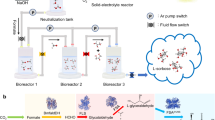The tandem CO2 electrolysis system operated stably while producing effluent with high acetate-to-electrolyte ratios. The electrolyser voltage for the CO2 electrolyser remained constant near 2.95 V (Fig. 2f) with less than a 60 mV increase in voltage over the six-hour experiment. The CO reactor operated at 2.22 V with a voltage increase of 160 mV over the course of the experiment (Fig. 2f), which is attributed to the pH shift in the electrolyte from 13.7 to 13.4 as acetate accumulated. Both catholyte (through the use of a cold-trap) and anolyte were collected and analysed for product quantification. As >99% of the produced acetate was collected in the anolyte, this was the primary effluent used for food production. The final effluent produced contained 0.75 M acetate and an acetate-to-electrolyte salt ratio of 0.75, representing the highest recorded acetate-to-electrolyte product stream to date (Supplementary Table 1).