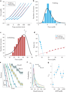 Liphardt, J., Dumont, S., Smith, S. B., Tinoco, I. Jr. & Bustamante, C. Equilibrium information from nonequilibrium measurements in an experimental test of Jarzynski’s equality. Science 296, 1832–1835 (2002). This study demonstrates the mechanical unfolding and refolding of RNA and is the first experimental validation of Jarzynski’s equality, which relates irreversible work to equilibrium free energy difference.
