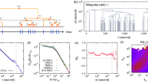 Further examples of bursty behavior at the individual level have been observed in the digital records of human communication activities through different channels4,24,25,26,27,28. Over the last few years different explanations have been proposed about the origin of inhomogeneous human dynamics4,24,29, including the single event level30 and about the impact of circadian and weekly fluctuations31. Moreover, by using novel technology of Radio Frequency ID's, heterogeneous temporal behavior was observed in the dynamics of face-to-face interactions32,33. This was explained by a reinforcement dynamics34,35 driving the decision making process at the single entity level.