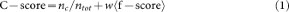 Thus, we define a confidence score, C-score, as the linear combination of the normalized cluster size of the first cluster and the average gapless threading score of the top fragments (f-score):