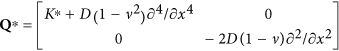 Herein Ω denotes the plate domain; x and y are the Cartesian coordinates; w is the plate’s transverse deflection for static bending problems and is mode shape function for free vibration; My is the bending moment; ν is the Poisson’s ratio; D is the flexural rigidity; θ and T will be interpreted after equation (4). χ equals Kw2/2 − qw for static bending problems and K*w2/2 for free vibration, where K is the Winkler-type foundation modulus; q is the distributed transverse load; K* = K − ρhω2, in which ρ is the plate mass density, h is the plate thickness and ω is the circular frequency. The variations with respect to the independent w, θ, T and My, respectively, lead to a matrix equation