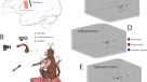 The monkeys were operantly conditioned to drive the mobile robotic wheelchair toward a food reward (grape). The rewards were delivered by an automated grape dispenser. Each experimental session consisted of about 150 trials during which the monkeys navigated to the grape from a starting location, reached for the grape and placed it in the mouth. The robotic wheelchair was then driven away from the grape dispenser to a new starting location.