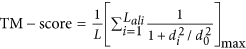 , where L is the length of the shorter protein (local TM-score) or mean length of the two proteins being compared (global TM-score), Lali is the number of equivalent residues in the two proteins, di is the distance of the i th pair of the equivalent residues between the two superposed structures,