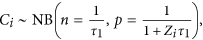 where n and p denote the size and probability of the NB distribution, and τ1 denotes an over-dispersion parameter which will be estimated. The mean and variance of the NB distribution are given by