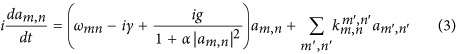 In equation (1), am,n is the optical field amplitude in the cavity element characterized by the integer indices m and n, ωo is the uniform resonant frequency resonant modes of each isolated optical cavity, γ and g represents the optical loss (radiation and material) and gain, respectively while