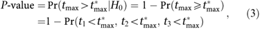 The statistics can be used to test over null hypotheses, H0: μ1=μ2=μ3, on the other hand, in pharmacogenomics studies, alternative hypotheses such as H1: μ1<μ2<μ3, μ1=μ2<μ3, μ1<μ2=μ3. The P-value for the probability distribution of Tmax under the over null hypotheses is calculated by using the complex property of integration in the multivariate t-distribution with singular correlation matrix,24 and the P-value is defined as in the following formula: